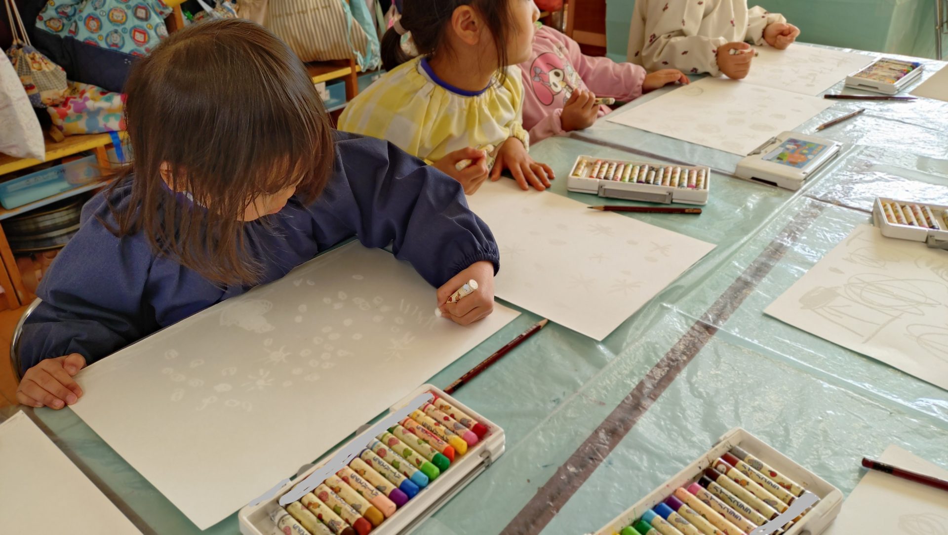 雪だるまを描いたり、たくさんの雪を画用紙いっぱいに描いていきます。