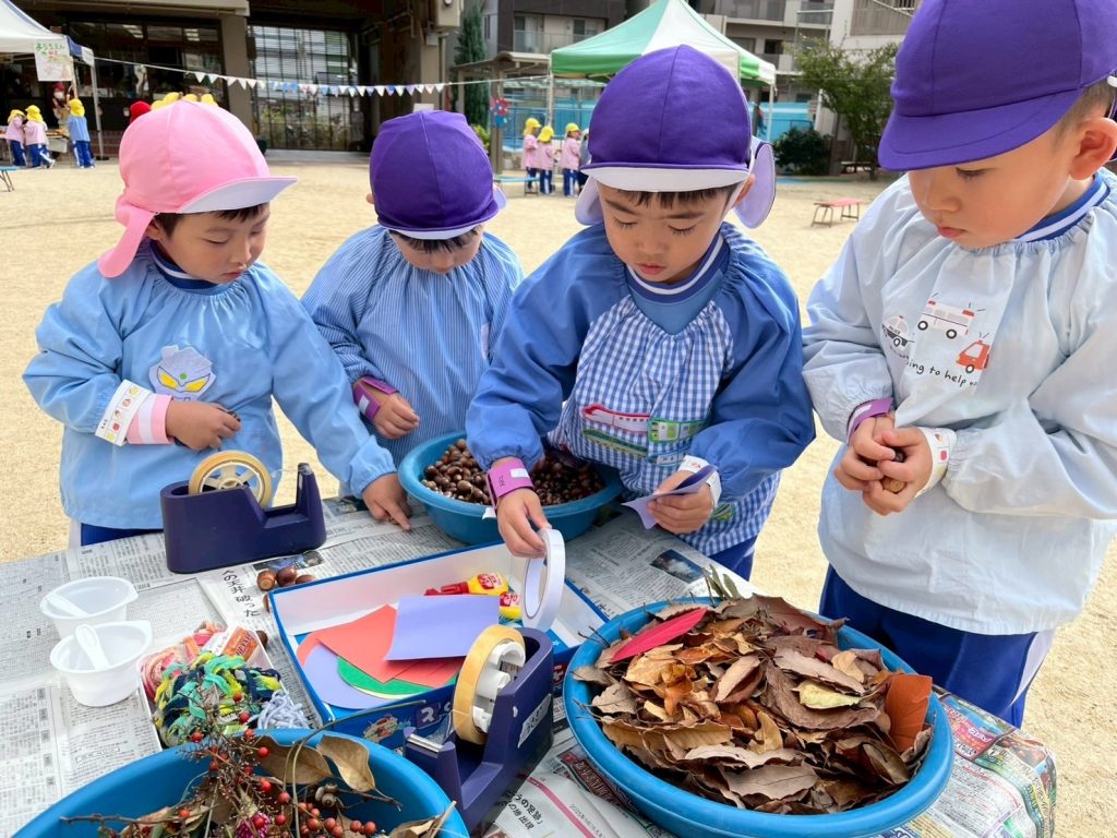 木の実や葉っぱを使って製作をしたり、どんぐりを転がしてコロコロコロ~