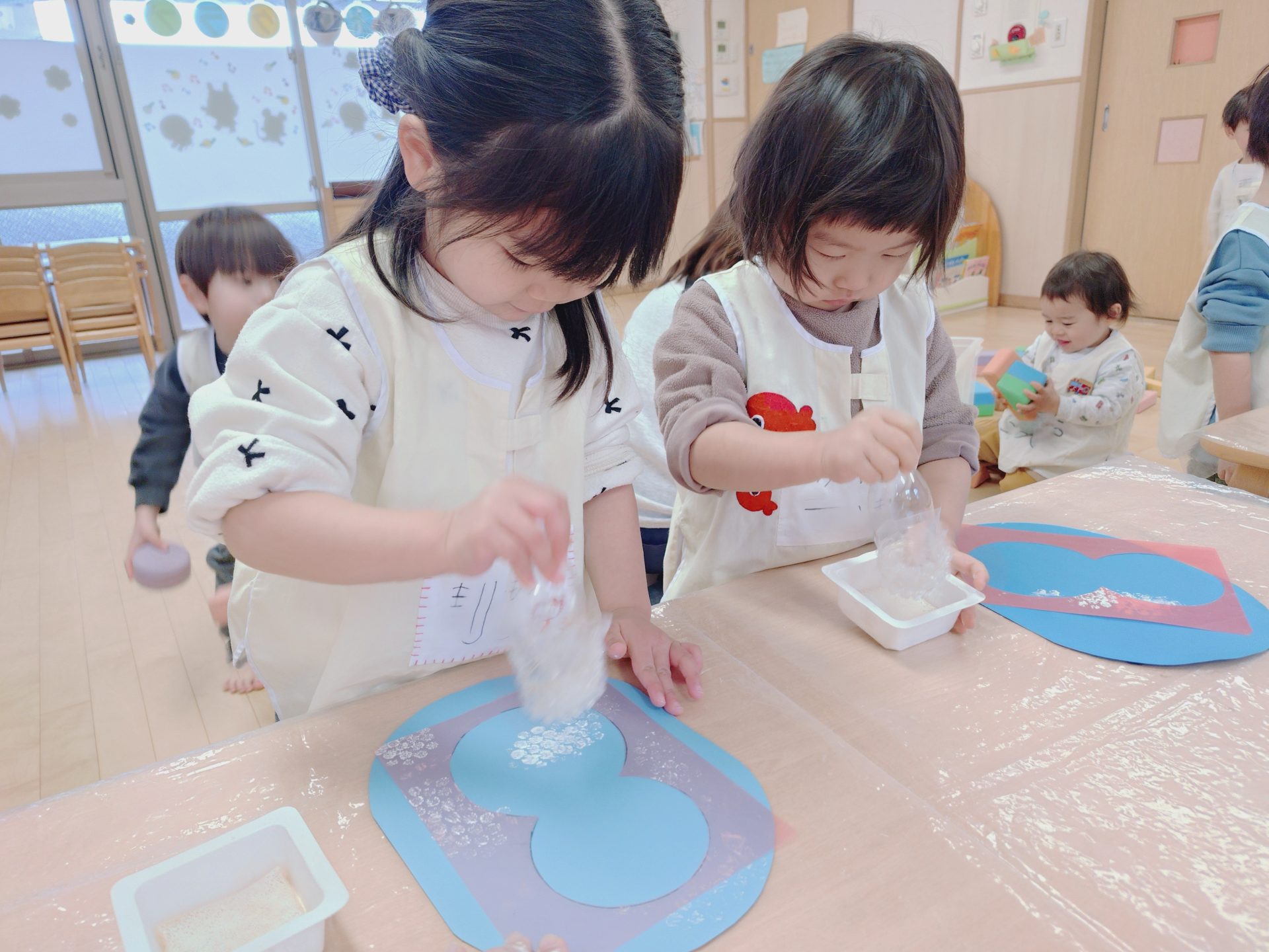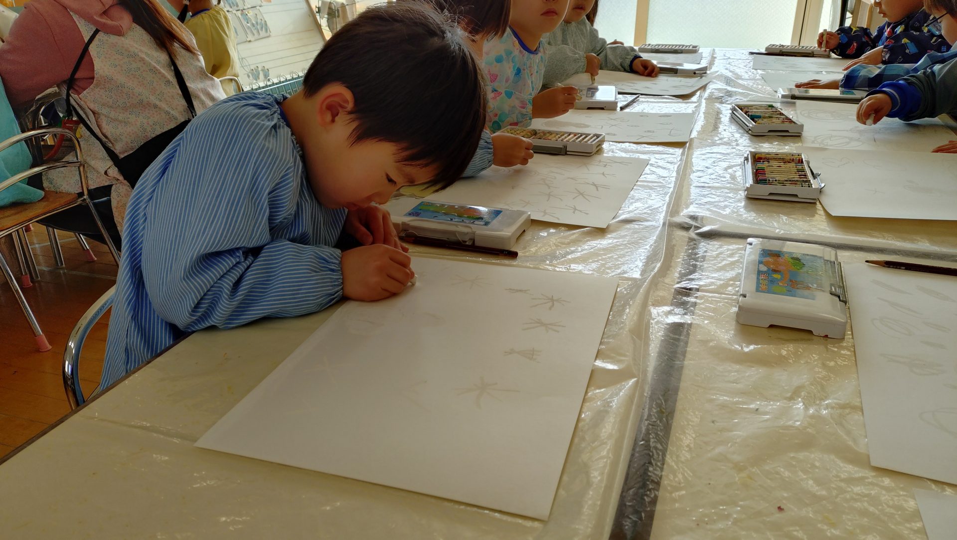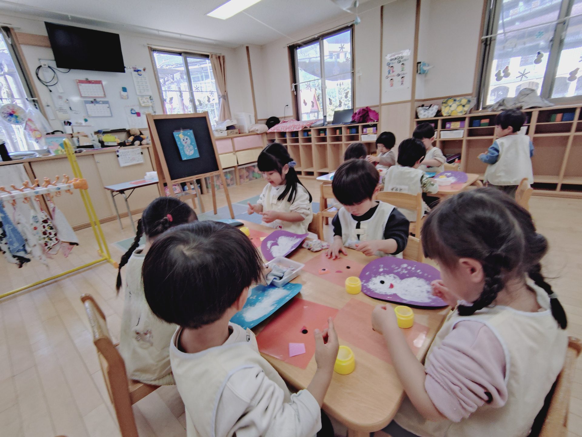 雪だるまを描いたり、たくさんの雪を画用紙いっぱいに描いていきます。