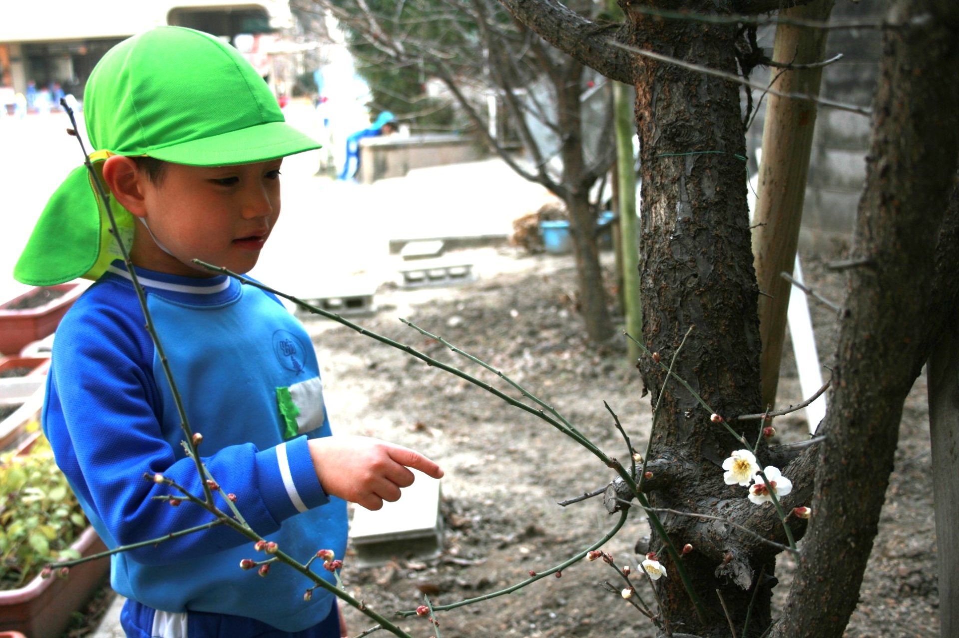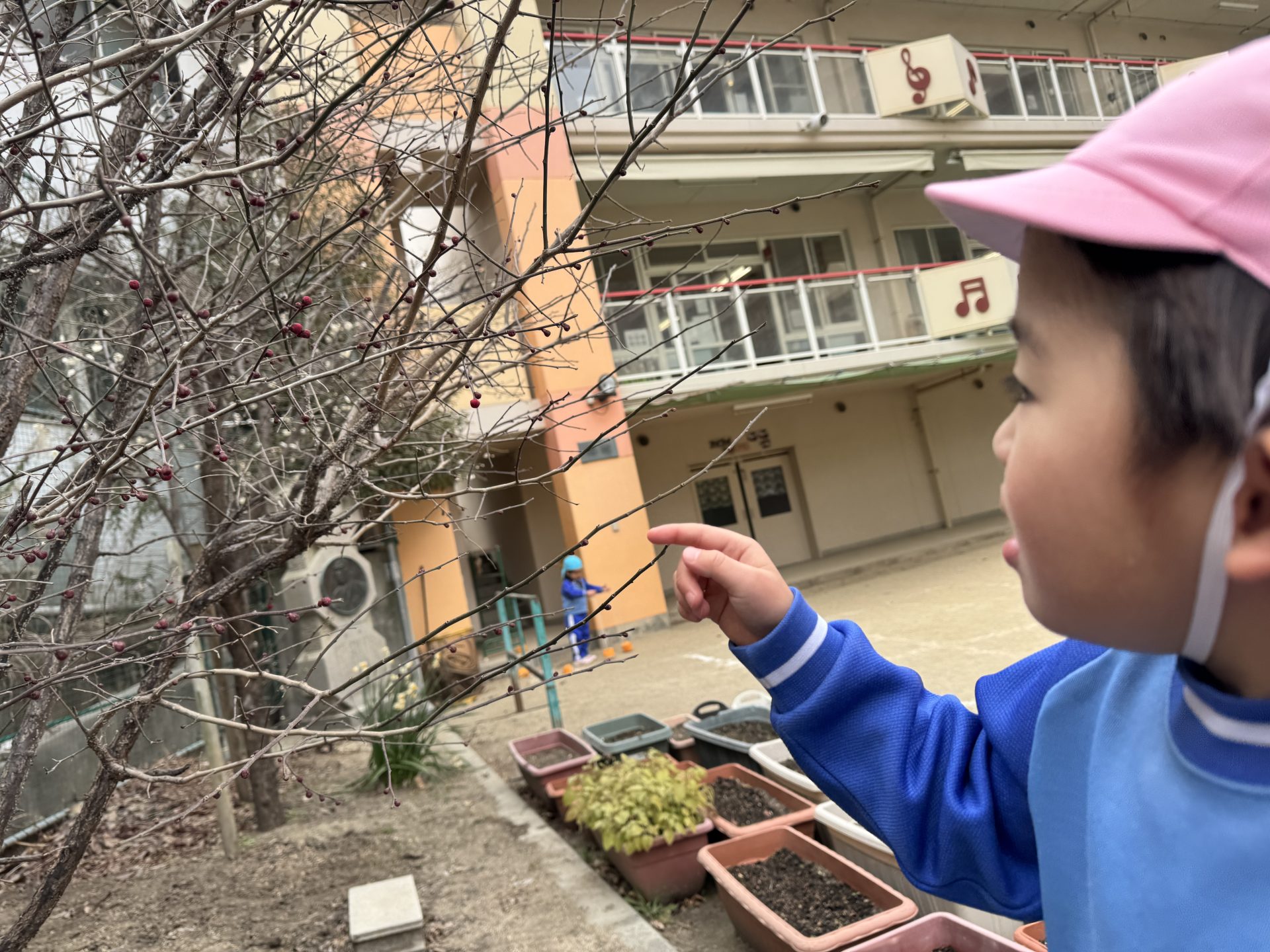 先日のお誕生会で園長先生より「まだまだ寒いけど、春はもうやってきてるよ」と、園庭の梅の花のつぼみがふくらんでいること、土の中で虫がそろそろ出番かな?と待っているお話を聞きました。