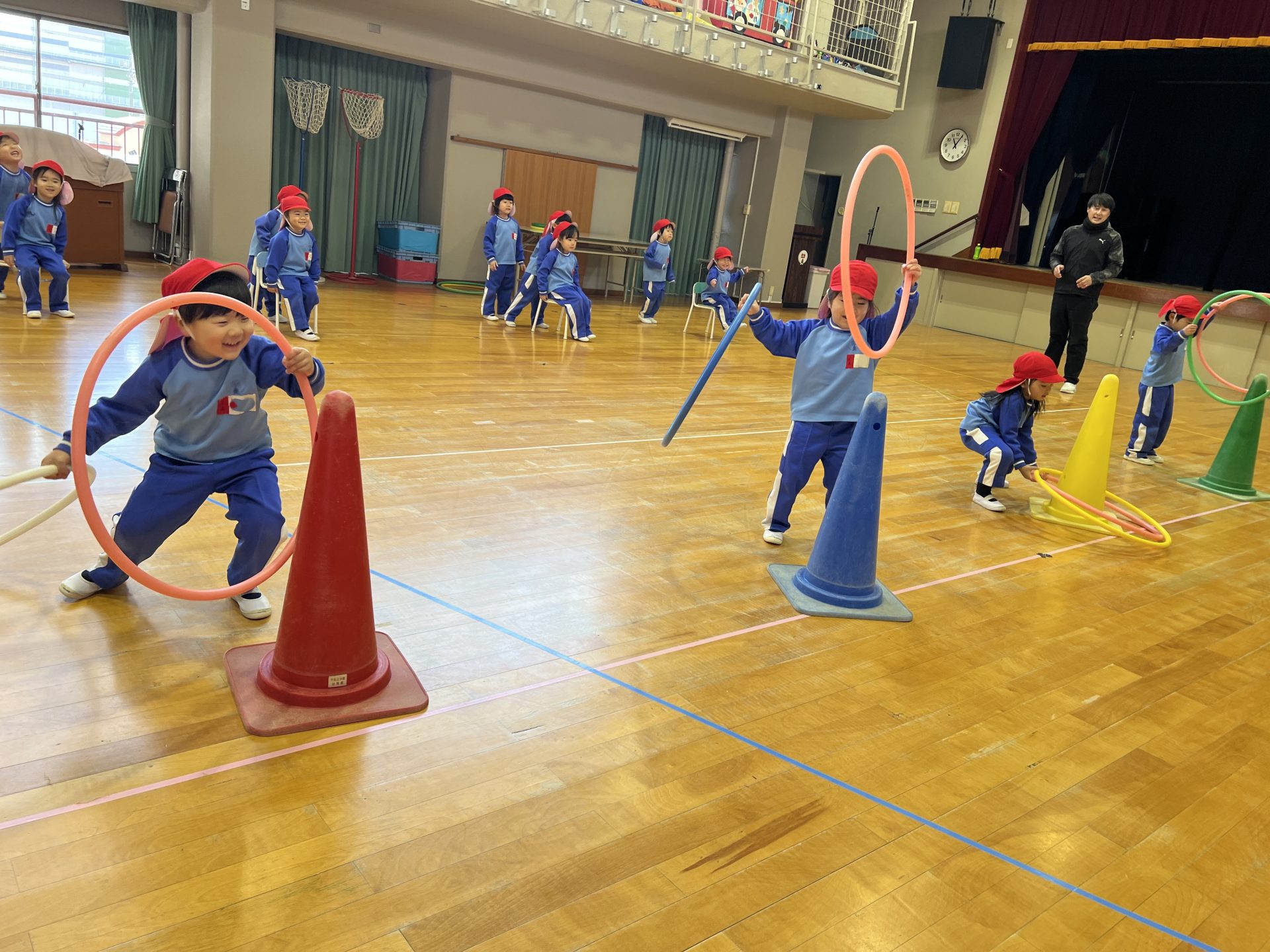 お友だちや先生と追いかけっこをしたり、フラフープでなんちゃってリレーにも挑戦しましたよ。